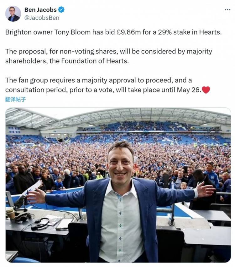 雅各布斯透露,布莱顿老板托尼-布鲁姆出价986万英镑,寻求收购哈茨俱乐部29%股份,该提案涉及非投票权股份,将由主要股东哈茨基金会审议,该球迷团队需要多数投票通过才能继续推进交易,投票前的咨询期持续到5月26日。